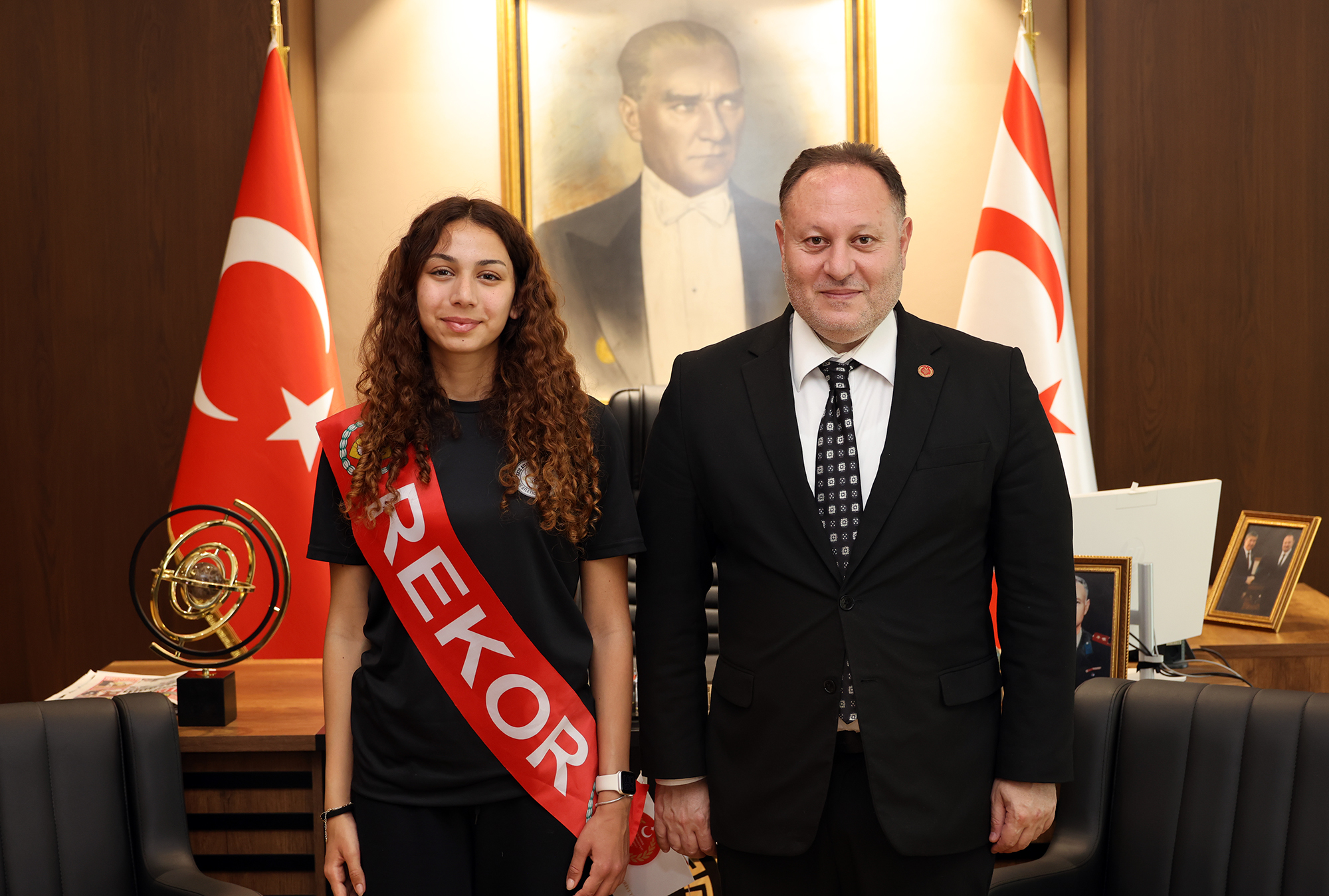 Cumhuriyet Meclisi Başkanı Ziya Öztürkler, 800 metre lise rekortmeni milli atlet Ada Kafa’yı kabul etti.Meclisi’ten yapılan açıklamaya  göre, Cumhuriyet Meclisi Başkanı Ziya Öztürkler kabulde yaptığı konuşmada, Ada Kafa’nın başarılarıyla Kıbrıs Türk halkına büyük gurur yaşattığını belirtti.Genç sporcunun hem Kuzey Kıbrıs Türk Cumhuriyeti’ni hem de Türkiye’yi temsil ederek önemli başarılara imza attığını kaydeden Öztürkler, Kafa’nın azmi, disiplini ve kararlılığıyla örnek bir başarı hikayesi yazdığını, elde edilen derecelerin toplumda büyük bir gurur yarattığını dile getirdi. Sporcunun başarısında emeği geçen federasyon, antrenör, okul ve ailesine de teşekkür eden Öztürkler, Kıbrıs Türk gençliğine Ada Kafa’nın örnek gösterilmesi gerektiğini ifade etti.Kıbrıs Türk halkına uygulanan izolasyonların sporcuları da etkilediğine işaret eden Öztürkler, izolasyonların kaldırılması çağrısını yineledi. İzolasyonlara rağmen genç sporcuların azim ve kararlılıkla elde ettiği önemli başarılarda Ada Kafa’nın en somut örneklerden biri olduğunu kaydeden Öztürkler, sporcunun ilerleyen dönemde daha büyük başarılara ulaşacağına inandığını ifade etti.-KafaAda Kafa ise, liseler arası yarışlarda kendi rekorunu kırdığını, sırada finallerin bulunduğunu, asıl hedefinin Temmuz’da İtalya’da düzenlenecek 18 Yaş Avrupa Şampiyonası olduğunu söyledi. Kafa, kamp programlarını bu çerçevede planladıklarını kaydetti.Kabulde Kafa’nın antrenörü Hasan Maydon ve KKTC Atletizm Federasyonu Başkanı Ferhat Sakallı da yer aldı. Başkan Öztürkler kabulde, sporcu Ada Kafa ve antrenörü Hasan Maydo’ya Meclis Anı Madalyası verdi.(ID/HUR)
