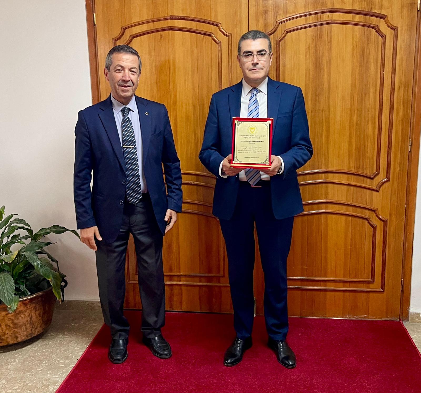 Dışişleri Bakanı Tahsin Ertuğruloğlu, emekli olan Bakanlık Müsteşarı Mustafa Lakadamyalı’ya hizmetlerinden dolayı teşekkür plaketi verdi.
