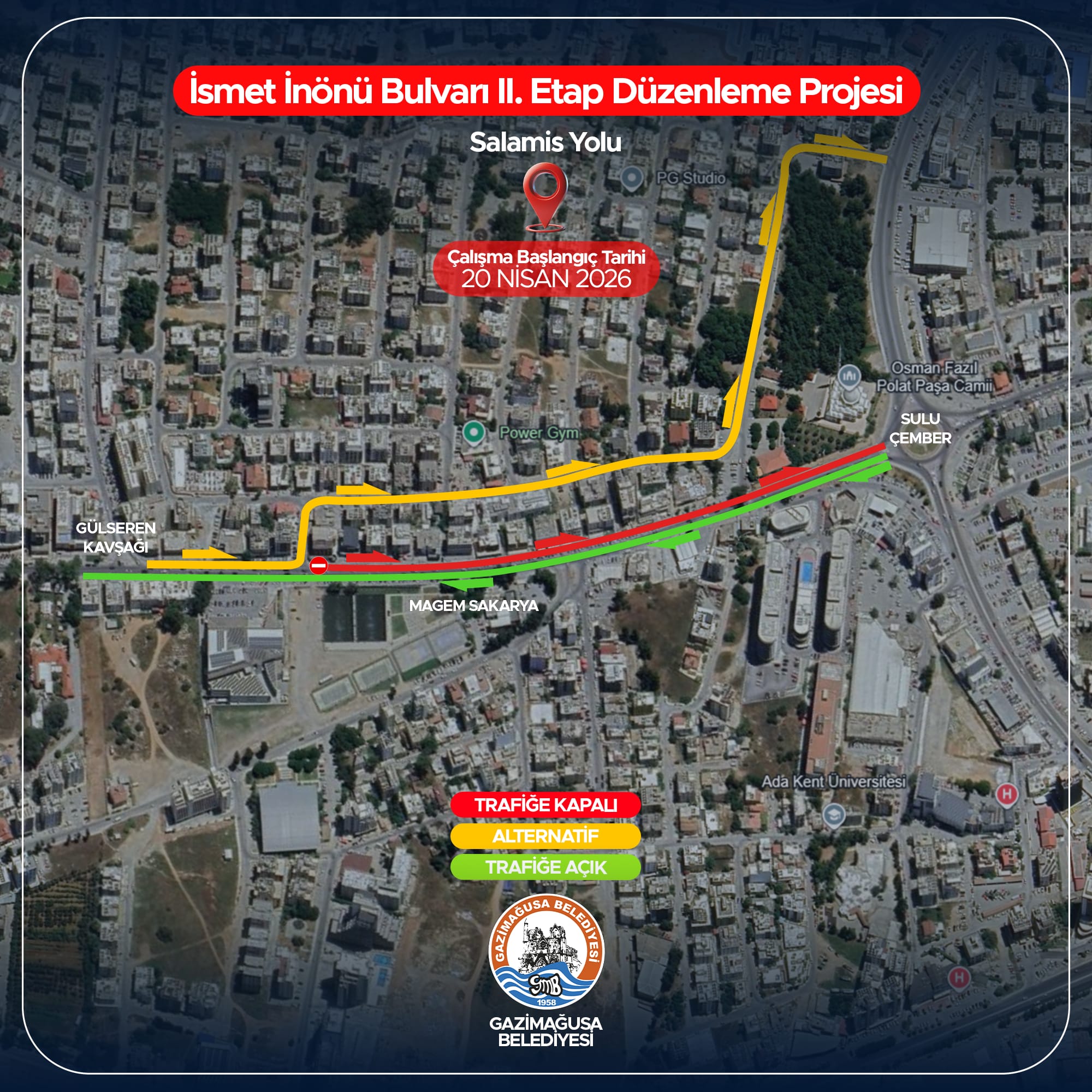 Gazimağusa Belediyesi tarafından yürütülen İsmet İnönü Bulvarı (Salamis Yolu) 2. Etap Düzenleme Projesi kapsamında, yarın başlayacak yol çalışmalarından etkilenecek yollar ve düzenlemeleri açıkladı.