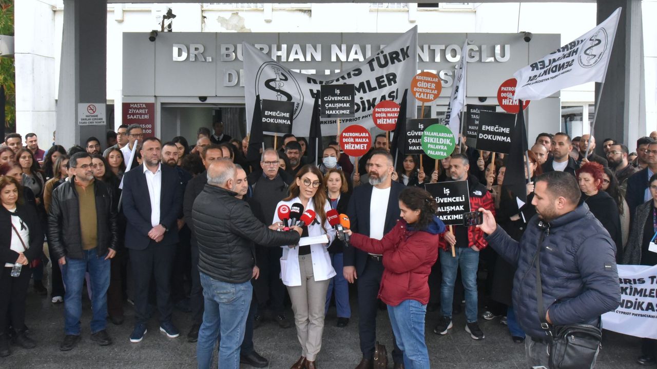 Lefkoşa Burhan Nalbantoğlu Devlet Hastanesi ana binası önünde basın açıklaması gerçekleştiren Tıp-İş’e, Kıbrıs Türk Tabipleri Birliği ile Kıbrıs İşçi ve Emekçi Sendikaları Federasyonu’nun (KİEF) yanı sıra bazı siyasi parti, sendika ve örgütler de destek verdi.